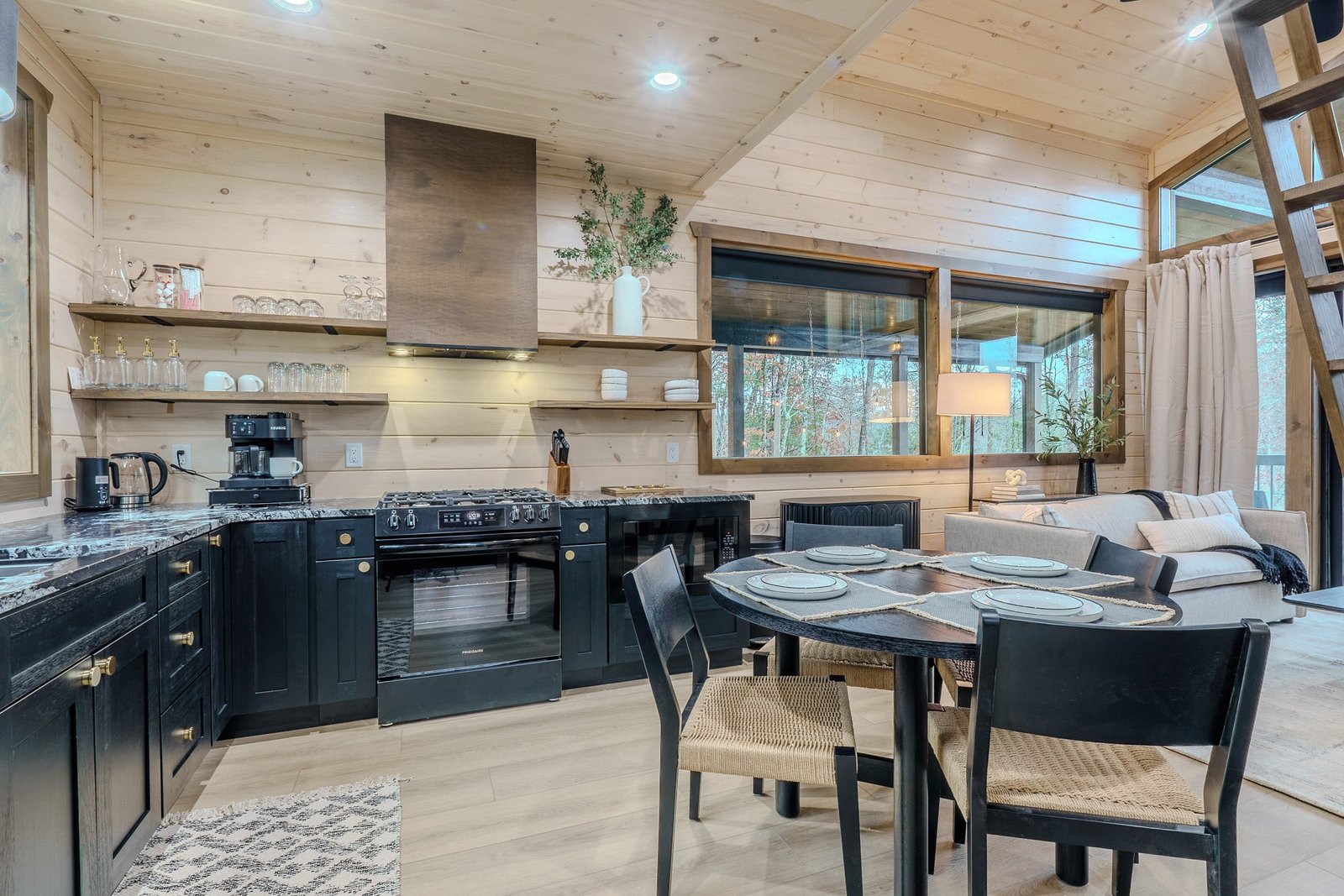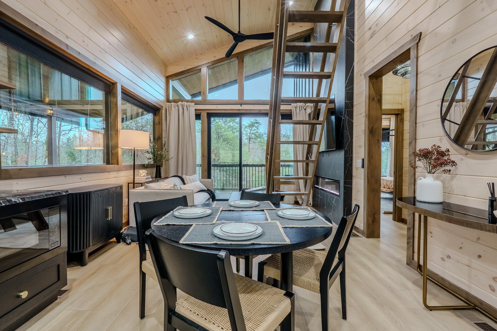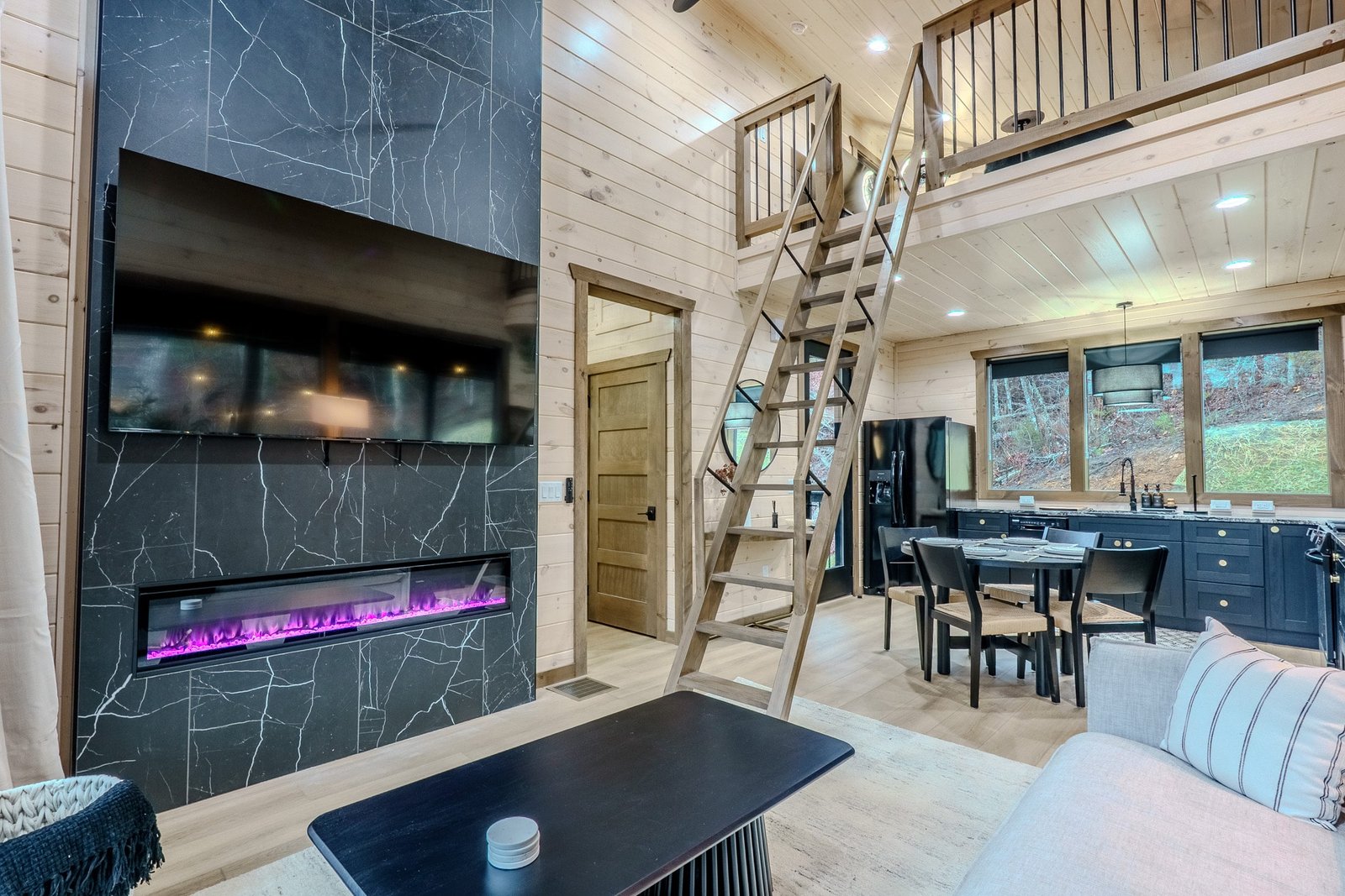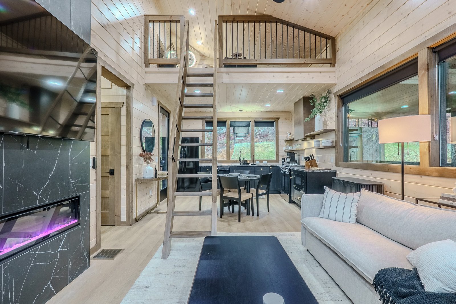 Gather and unwind in this beautifully designed open-concept space featuring soaring ceilings, floor-to-ceiling windows, a cozy seating area, and a queen sleeper sofa perfect for additional guests. Enjoy the warmth of the modern electric fireplace, stream your favorite shows, or step onto the deck for fresh mountain air. The fully equipped kitchen offers sleek appliances, spacious countertops, open shelving, and all the essentials for effortless meals, while the adjoining dining area provides a welcoming spot to eat, chat, and plan your adventures amid warm wood tones and natural light.