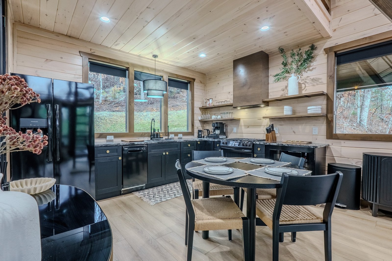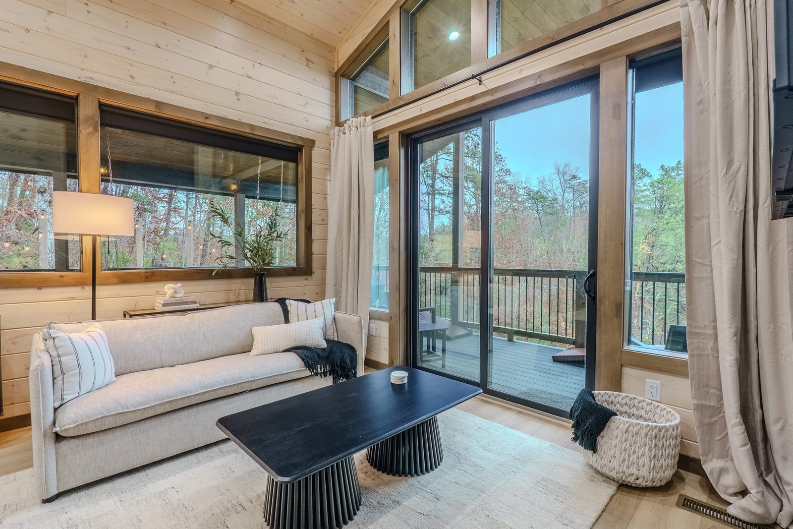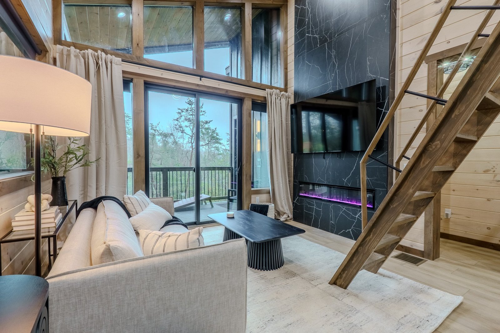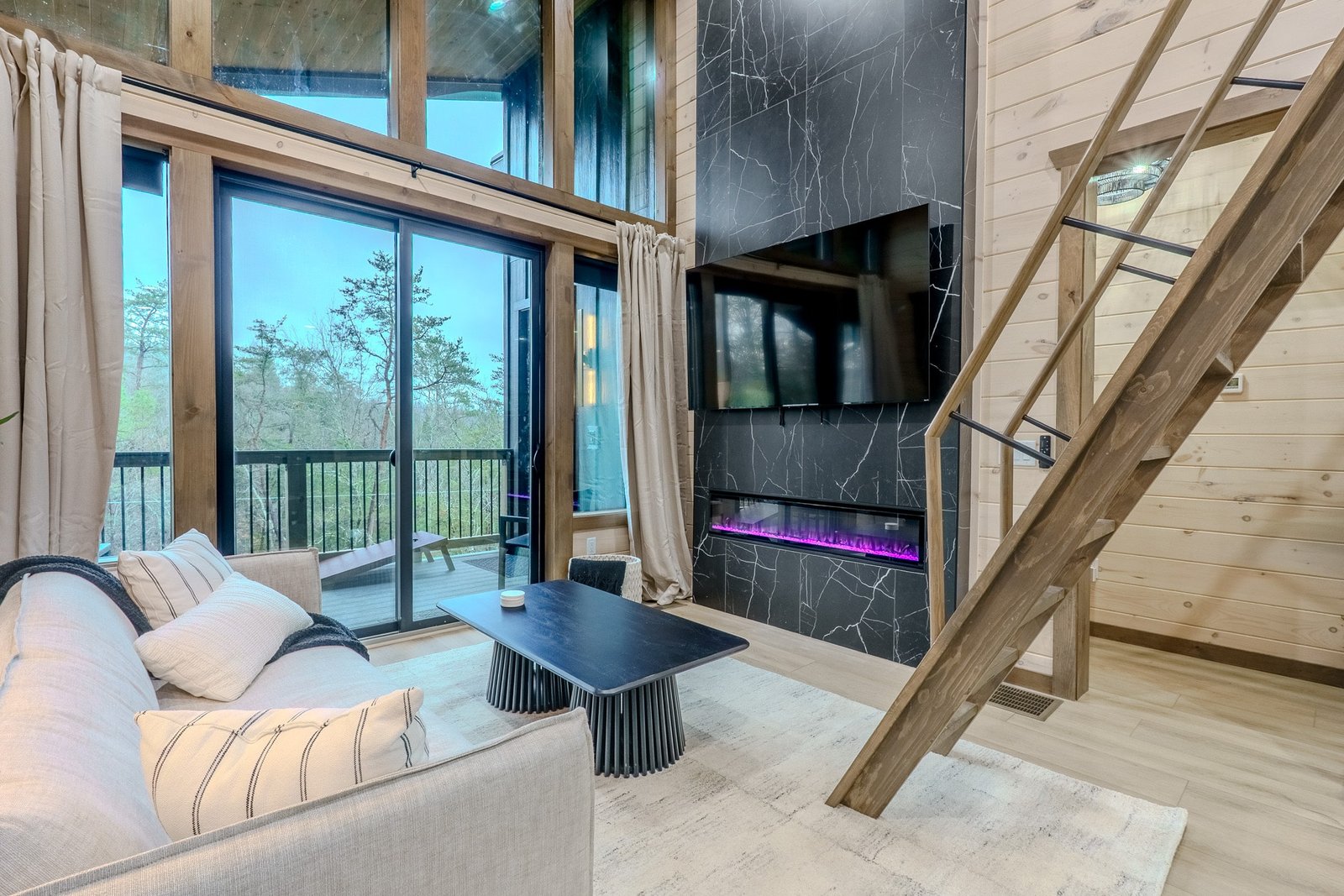 Gather and unwind in this beautifully designed open-concept space featuring soaring ceilings, floor-to-ceiling windows, a cozy seating area, and a queen sleeper sofa perfect for additional guests. Enjoy the warmth of the modern electric fireplace, stream your favorite shows, or step onto the deck for fresh mountain air. The fully equipped kitchen offers sleek appliances, spacious countertops, open shelving, and all the essentials for effortless meals, while the adjoining dining area provides a welcoming spot to eat, chat, and plan your adventures amid warm wood tones and natural light.