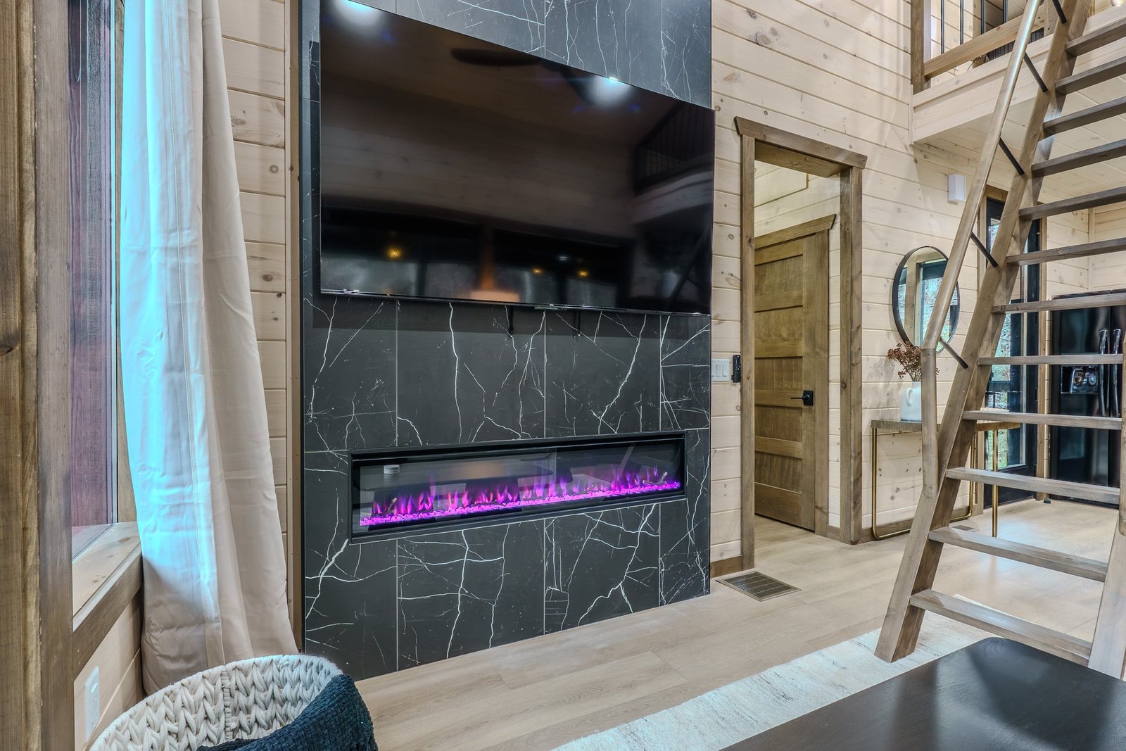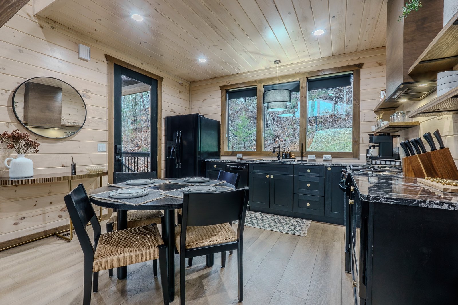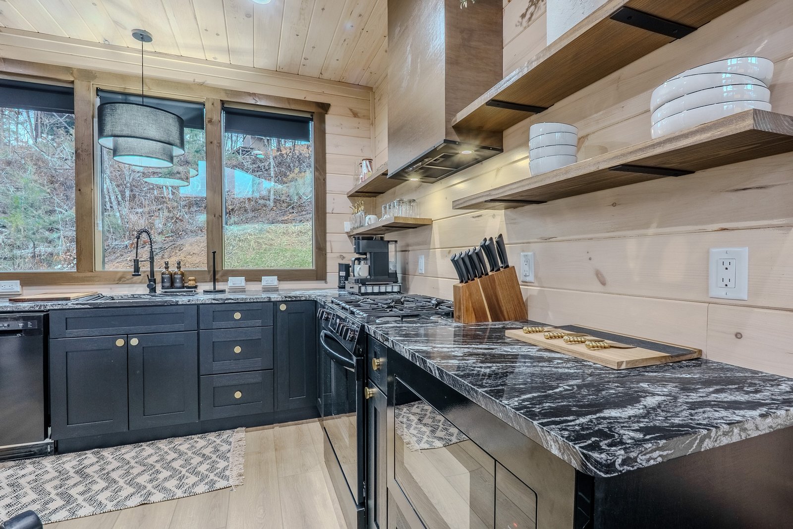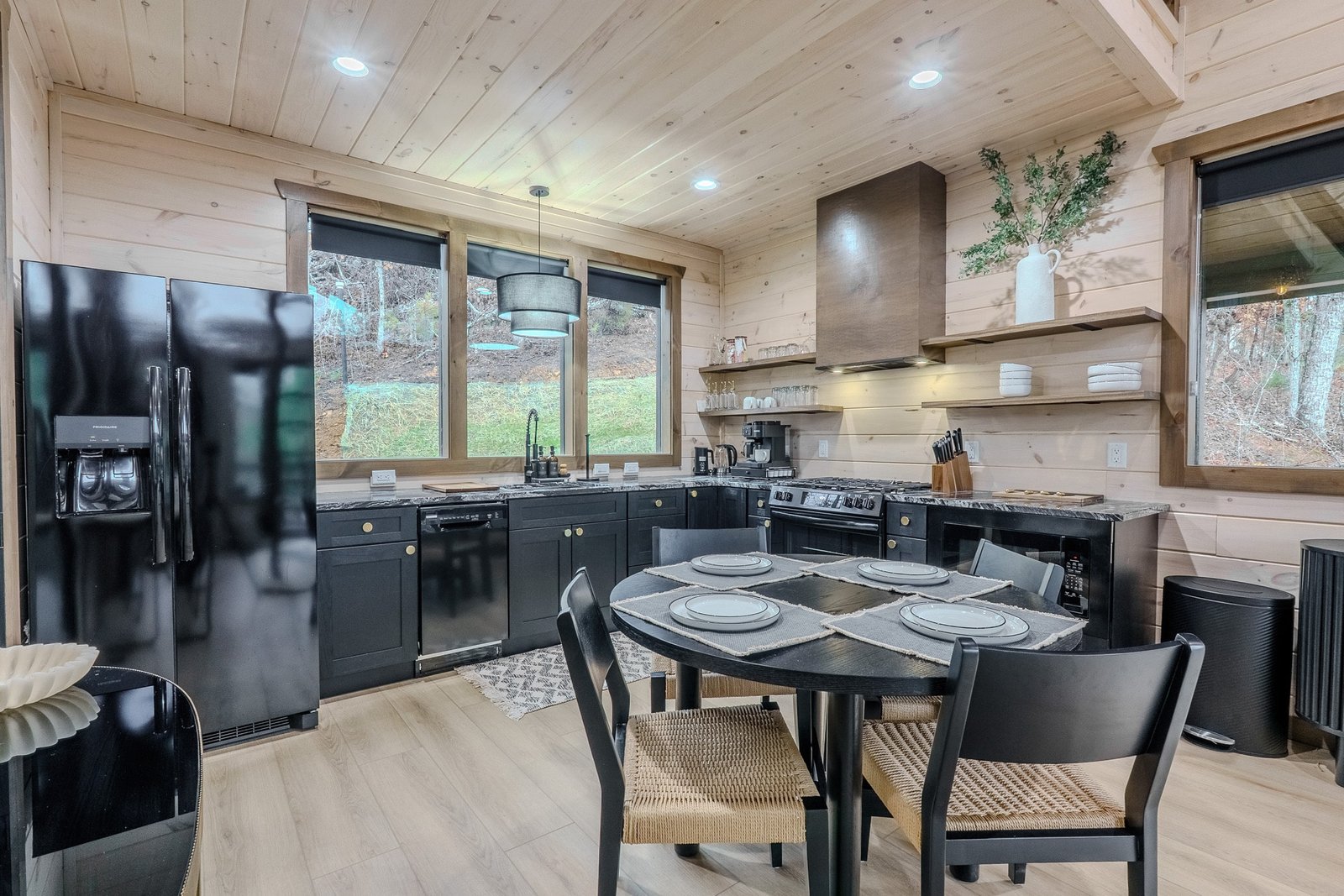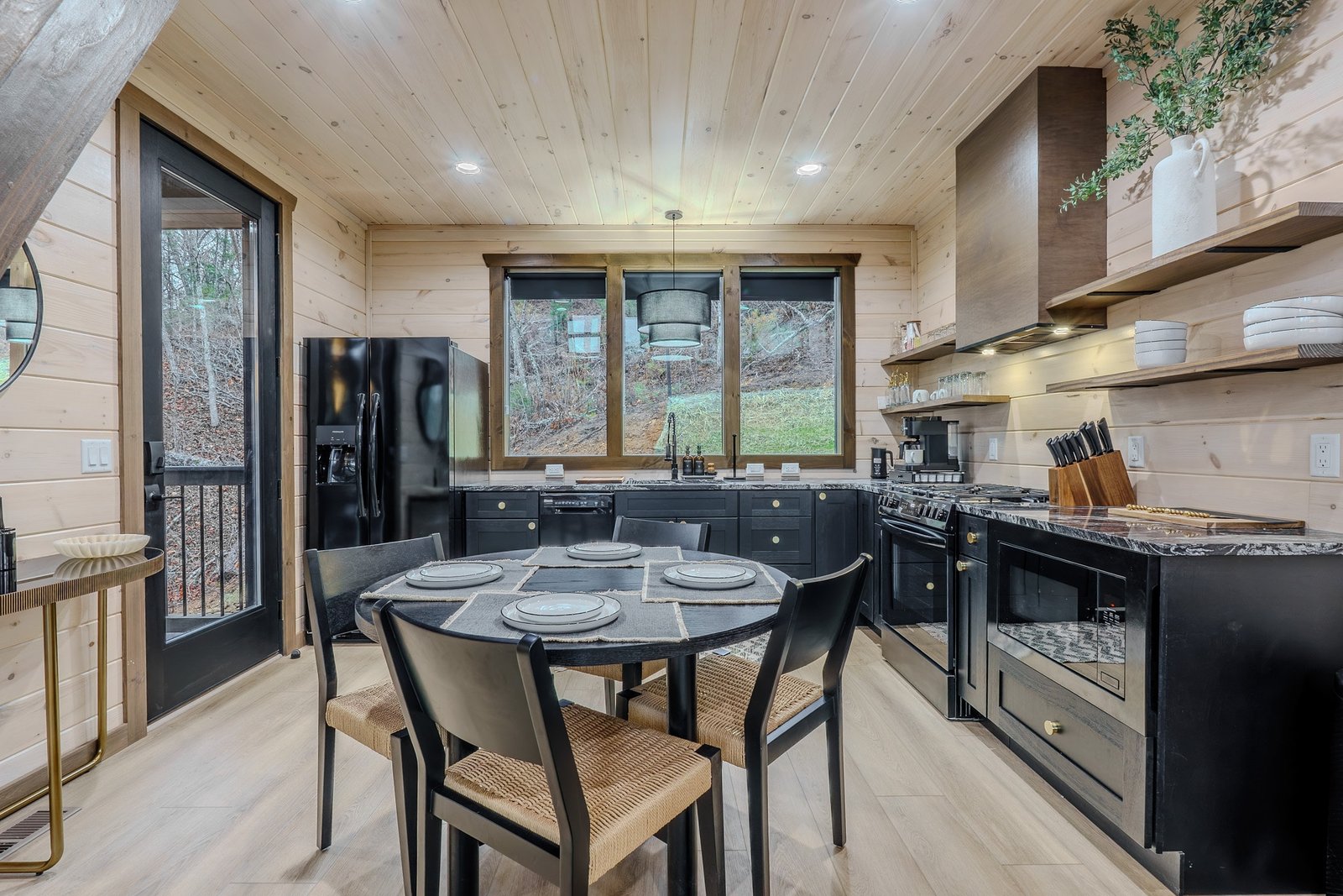 Gather and unwind in this beautifully designed open-concept space featuring soaring ceilings, floor-to-ceiling windows, a cozy seating area, and a queen sleeper sofa perfect for additional guests. Enjoy the warmth of the modern electric fireplace, stream your favorite shows, or step onto the deck for fresh mountain air. The fully equipped kitchen offers sleek appliances, spacious countertops, open shelving, and all the essentials for effortless meals, while the adjoining dining area provides a welcoming spot to eat, chat, and plan your adventures amid warm wood tones and natural light.