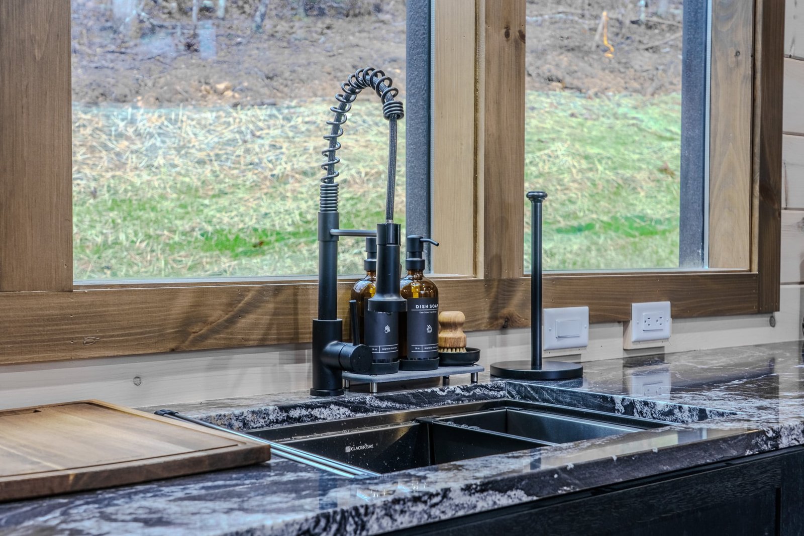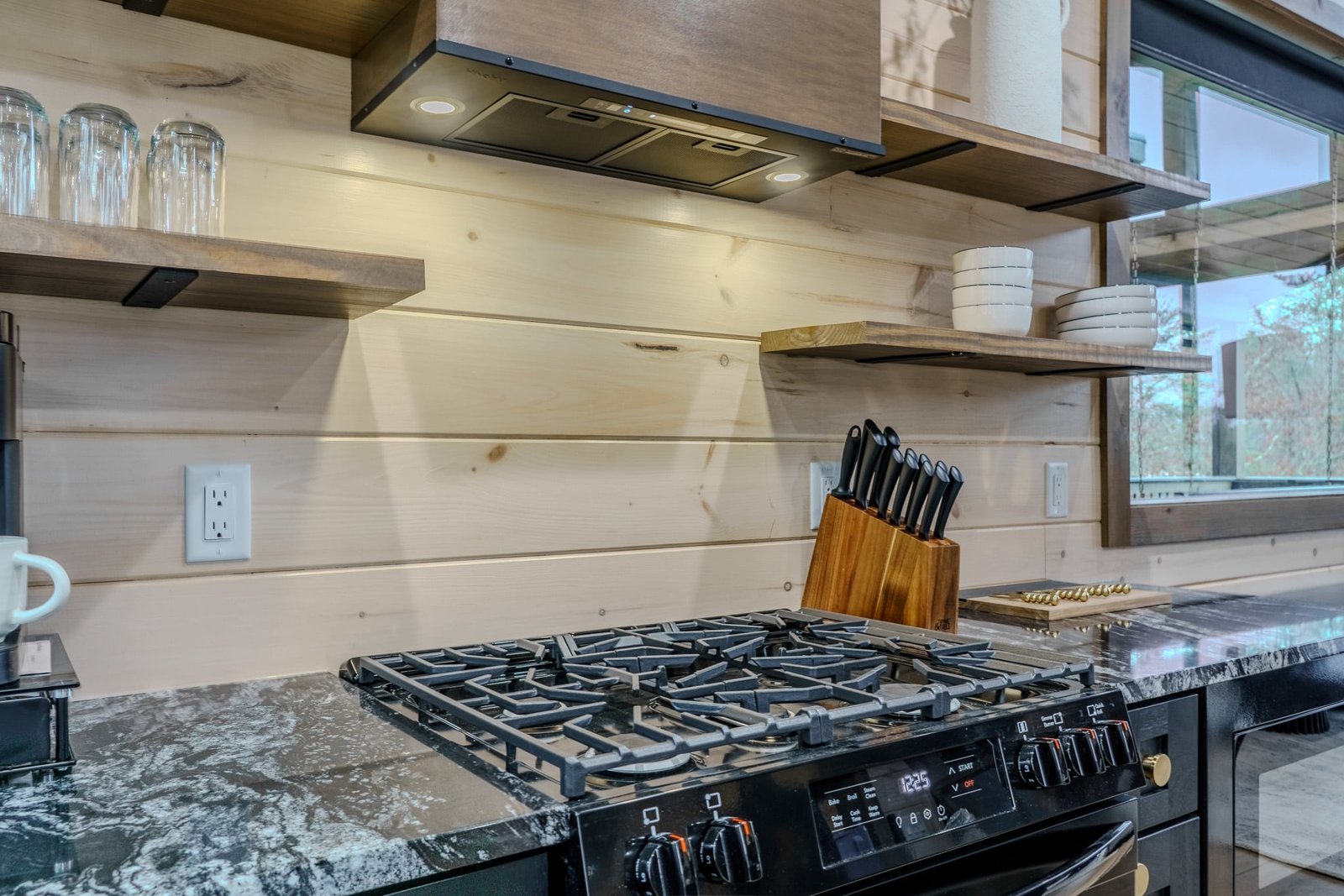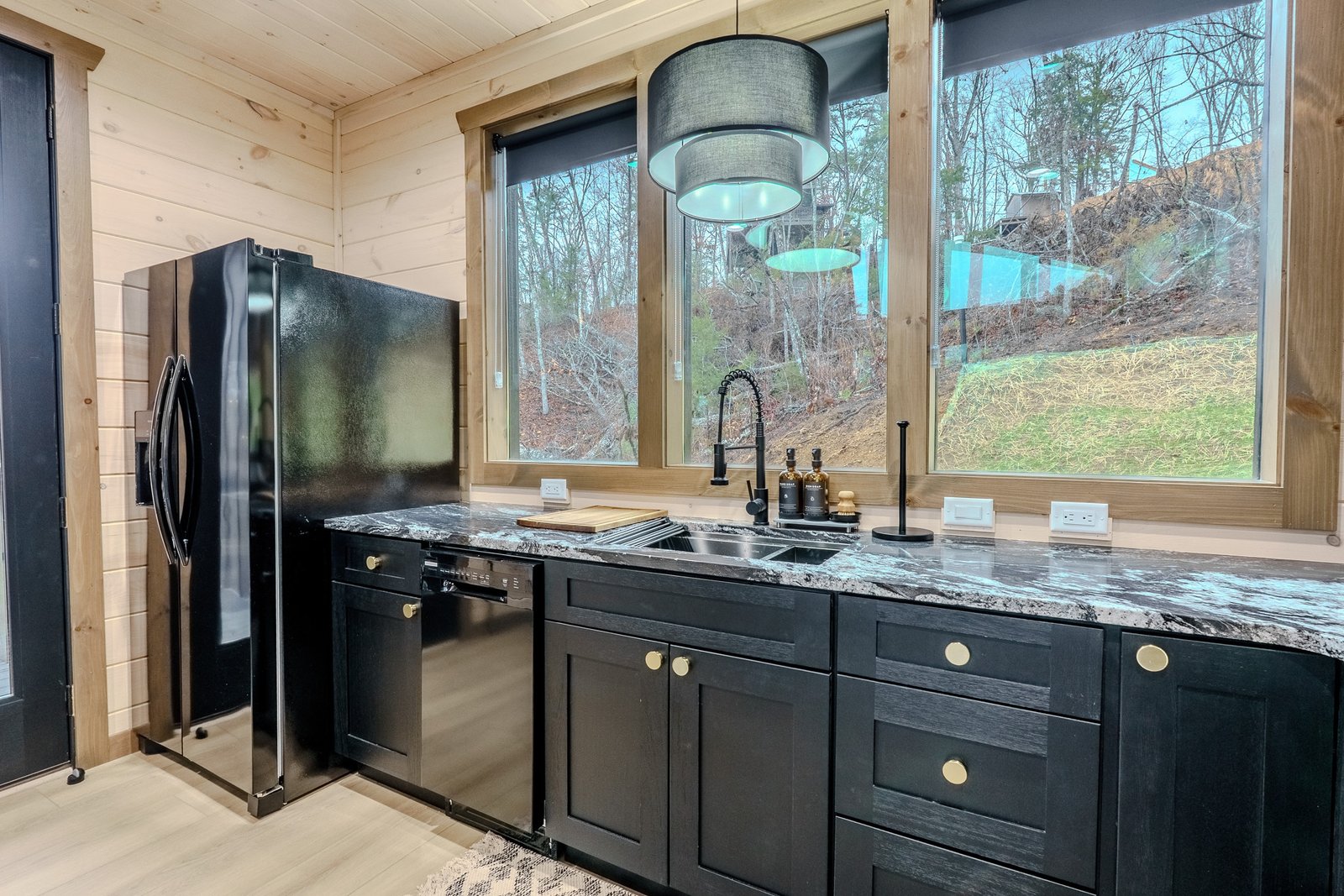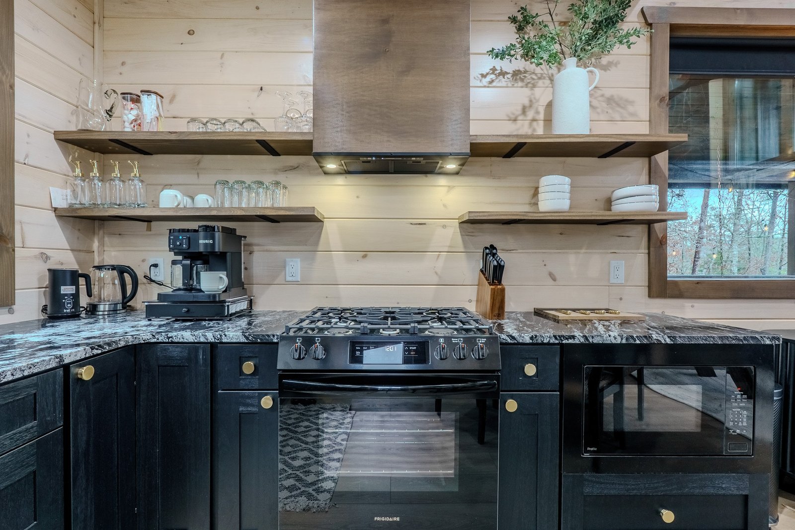 Gather and unwind in this beautifully designed open-concept space featuring soaring ceilings, floor-to-ceiling windows, a cozy seating area, and a queen sleeper sofa perfect for additional guests. Enjoy the warmth of the modern electric fireplace, stream your favorite shows, or step onto the deck for fresh mountain air. The fully equipped kitchen offers sleek appliances, spacious countertops, open shelving, and all the essentials for effortless meals, while the adjoining dining area provides a welcoming spot to eat, chat, and plan your adventures amid warm wood tones and natural light.