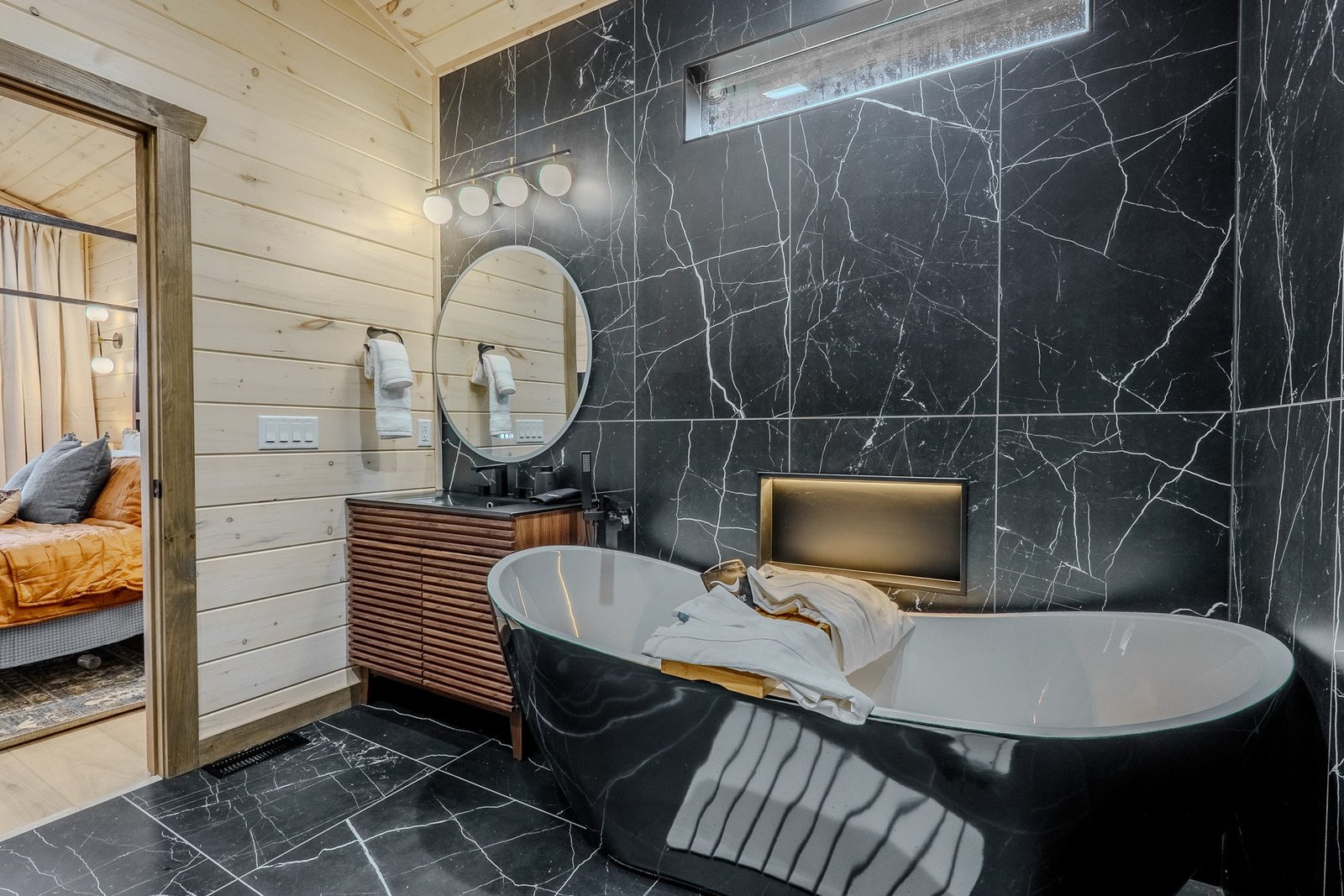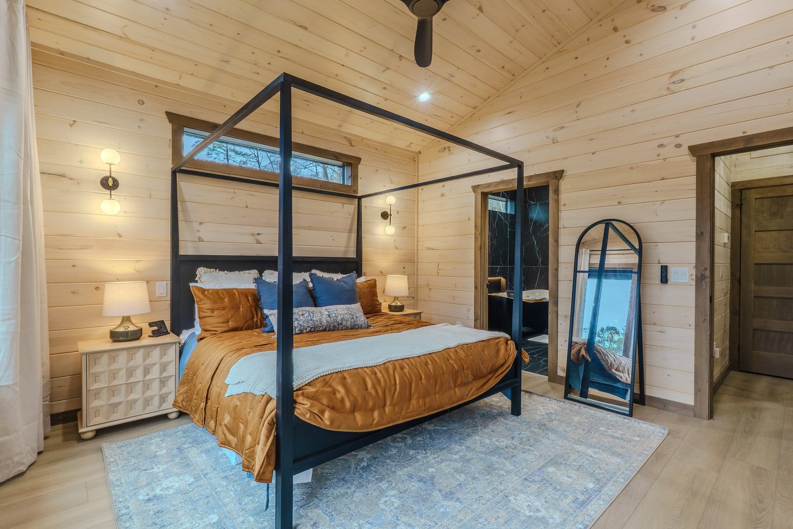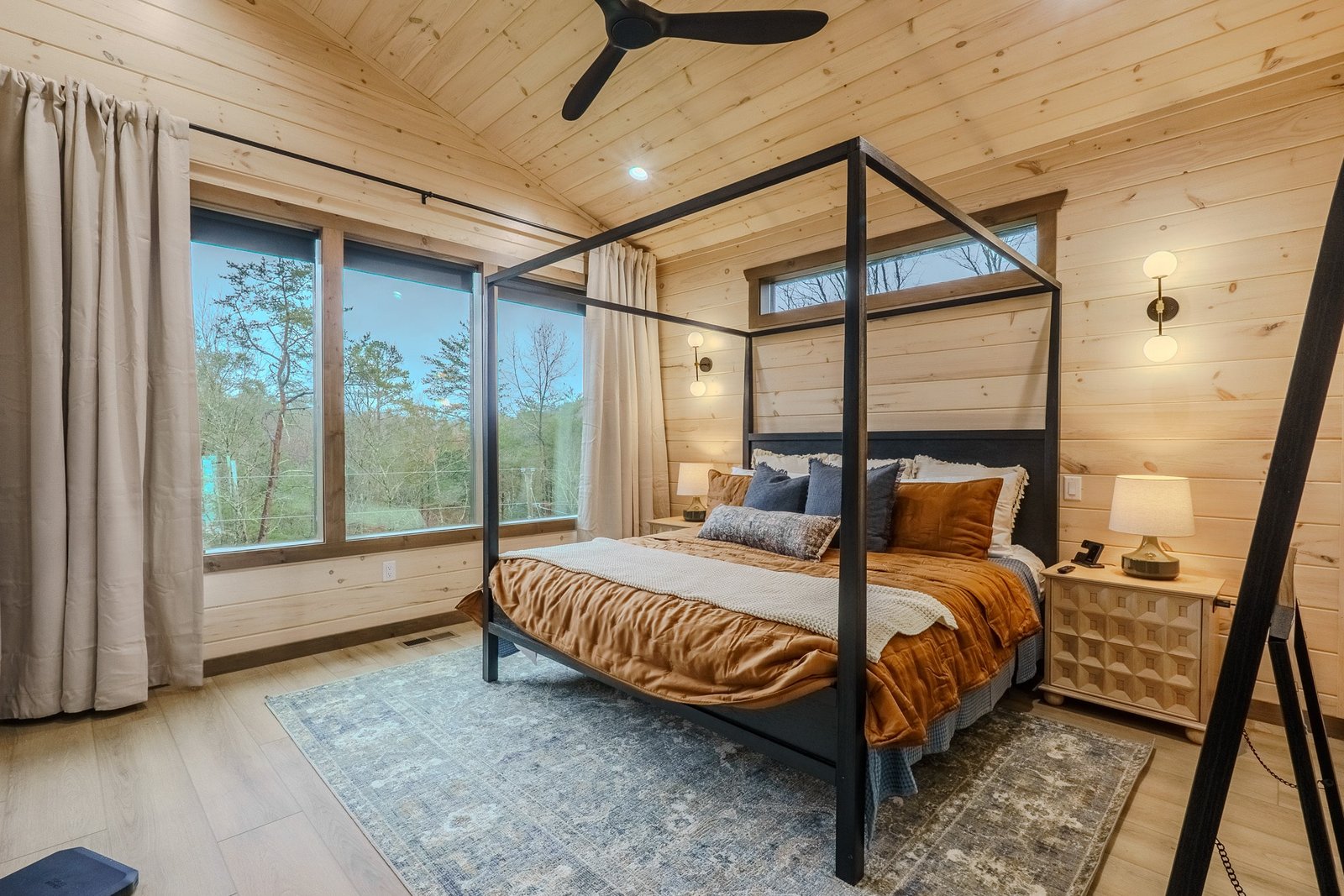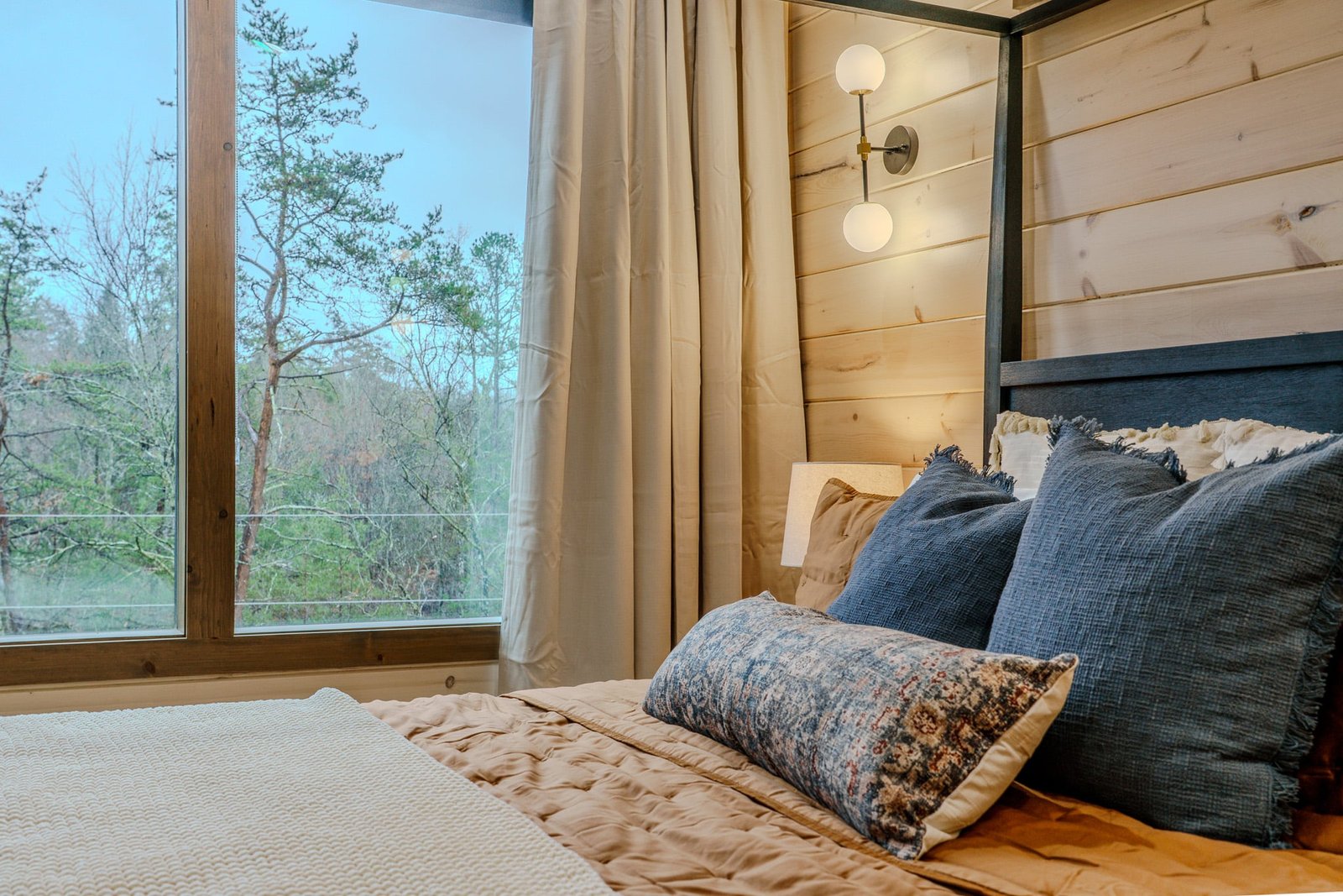 Retreat to the beautifully designed main-level bedroom, featuring a luxurious king bed framed by floor-to-ceiling windows that showcase peaceful wooded views. Soft linens, warm textures, and modern lighting create a cozy, romantic atmosphere, perfect for slow mornings and restful nights. This suite includes a private ensuite full bathroom, offering spa-like comfort just steps from the bed. Guests love the seamless blend of modern design, natural light, and total privacy.