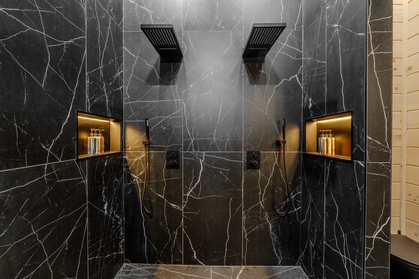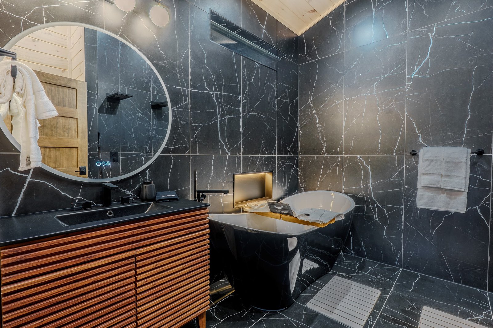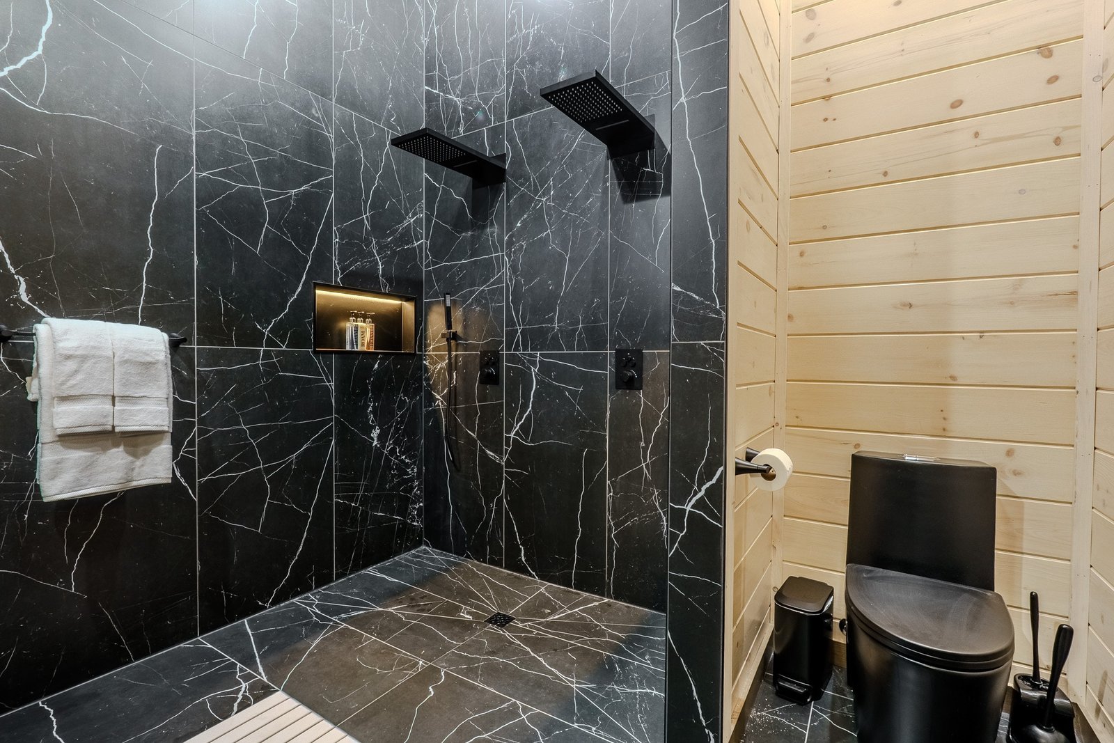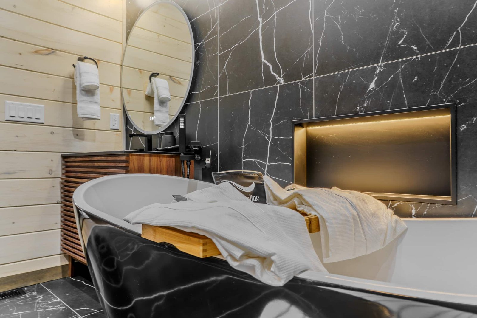 Retreat to the beautifully designed main-level bedroom, featuring a luxurious king bed framed by floor-to-ceiling windows that showcase peaceful wooded views. Soft linens, warm textures, and modern lighting create a cozy, romantic atmosphere, perfect for slow mornings and restful nights. This suite includes a private ensuite full bathroom, offering spa-like comfort just steps from the bed. Guests love the seamless blend of modern design, natural light, and total privacy.
