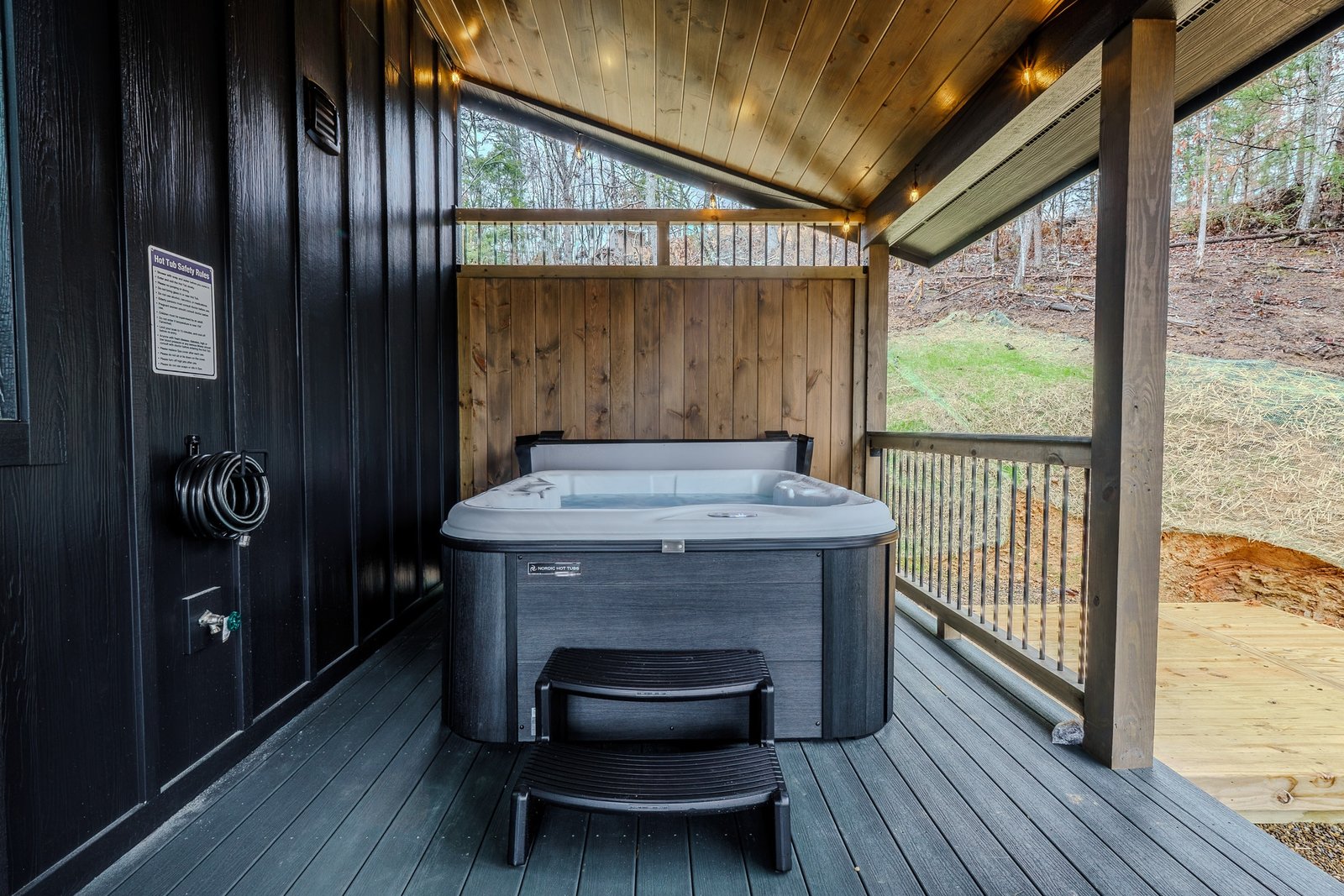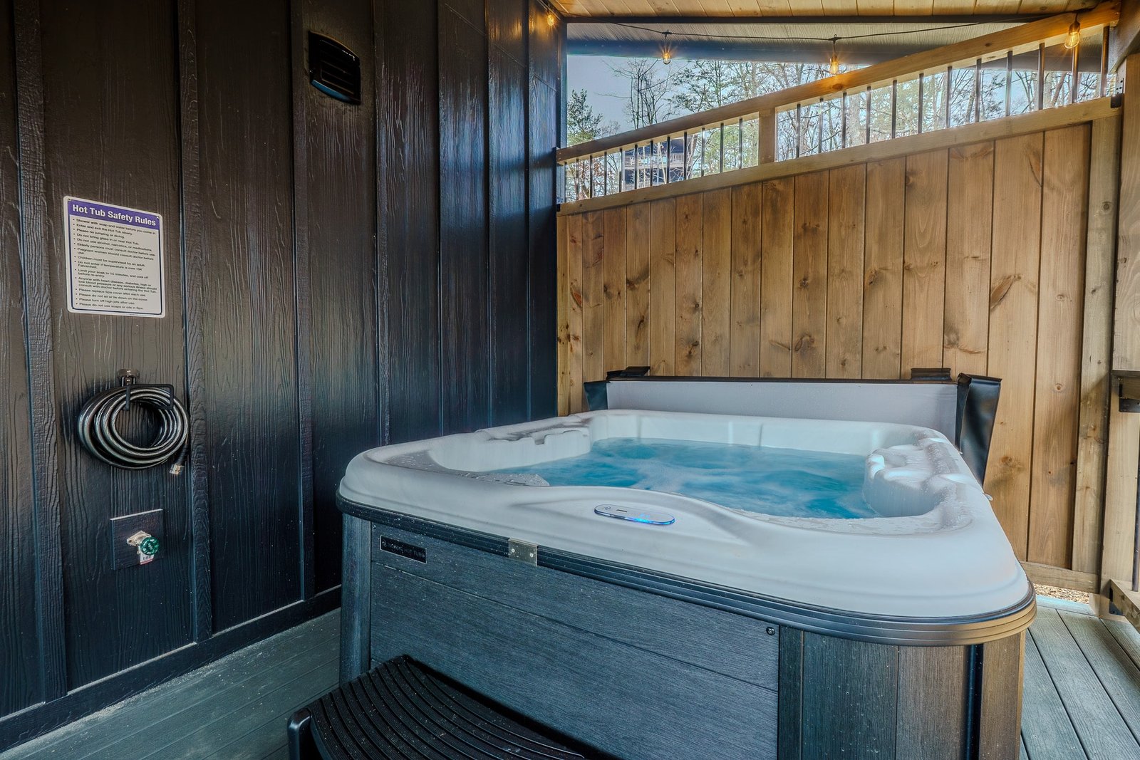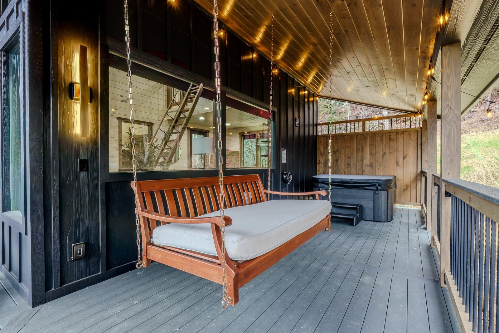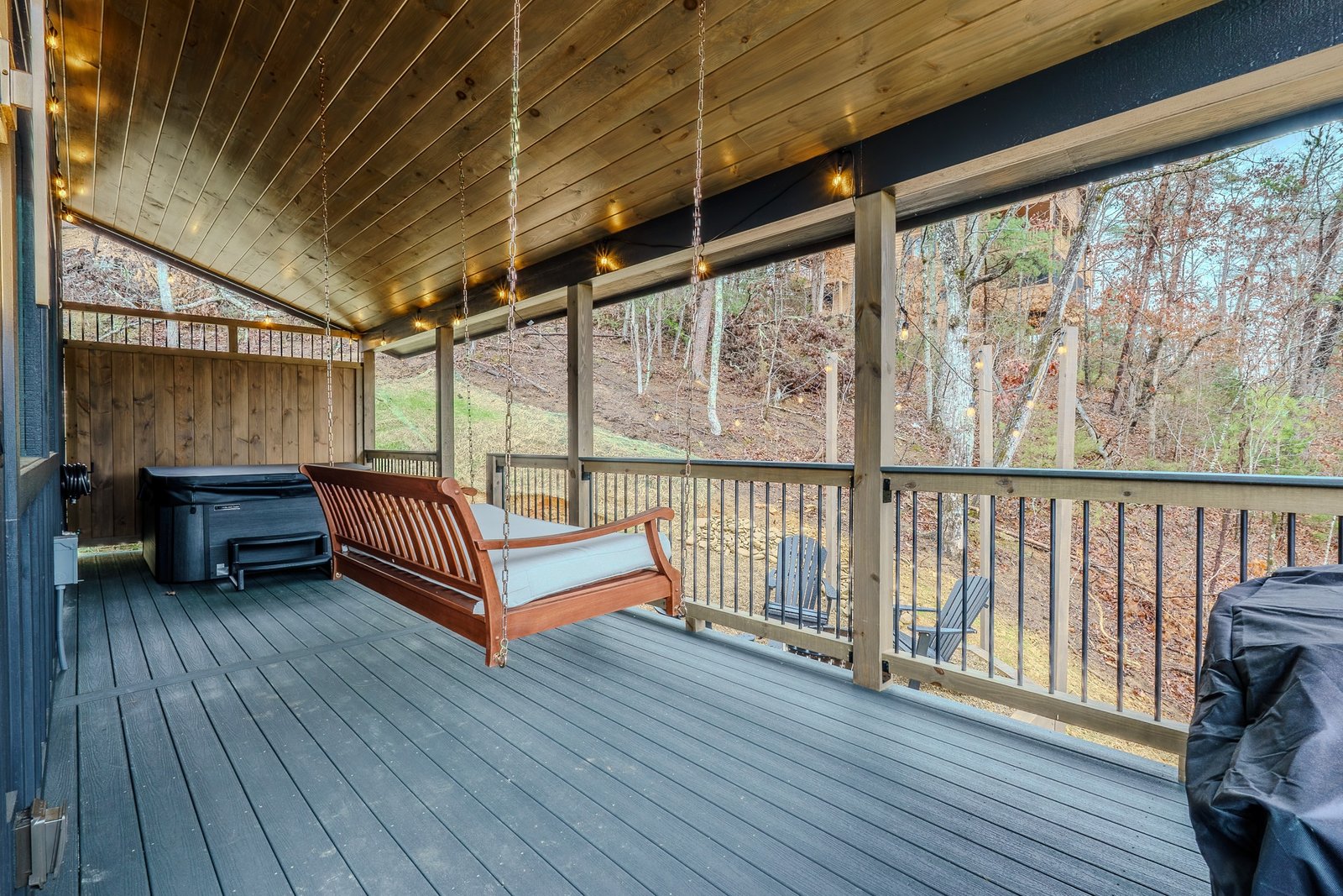 Step outside and enjoy a private mountain escape designed for relaxation and comfort. The spacious covered deck features a cozy swinging daybed, perfect for morning coffee, afternoon reading, or unwinding under twinkle lights in the evening.